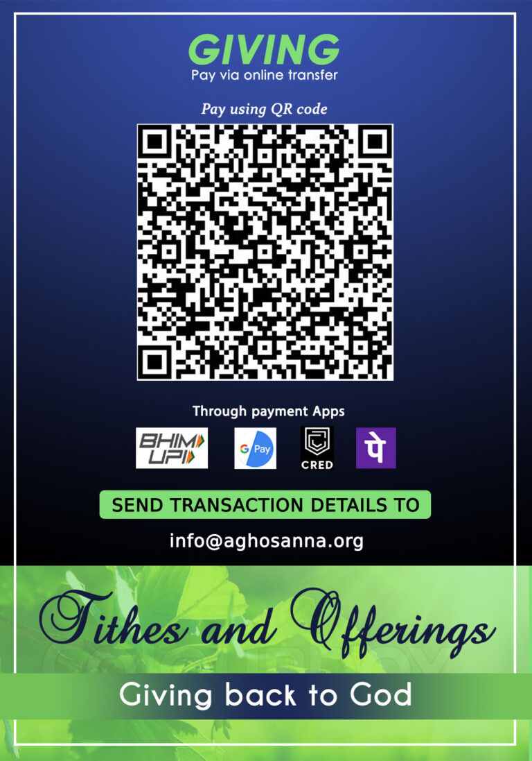 Giving is an expression of our love on God. It is also a part of worship and an act of ministry. The givings become giving as multitudes are supported by our ministries. The offerings will make a difference in the lives of different categories of people throughout the world. With what you give, we are able to meet the operational expenses of our church and support different wings of our ministerial activities. More than that, we extend our helping hand to meet the needs of Churches, Pastors and the various kinds of ministries among the underprivileged people in the downtrodden villages. Under the aegis of our church, Churches are constructed, needy Pastors were assisted. We also aid the people in needs and the people at large at the time of crisis like flood, Covid-19 and so on. Give magnanimously and become a part of our ministry.
